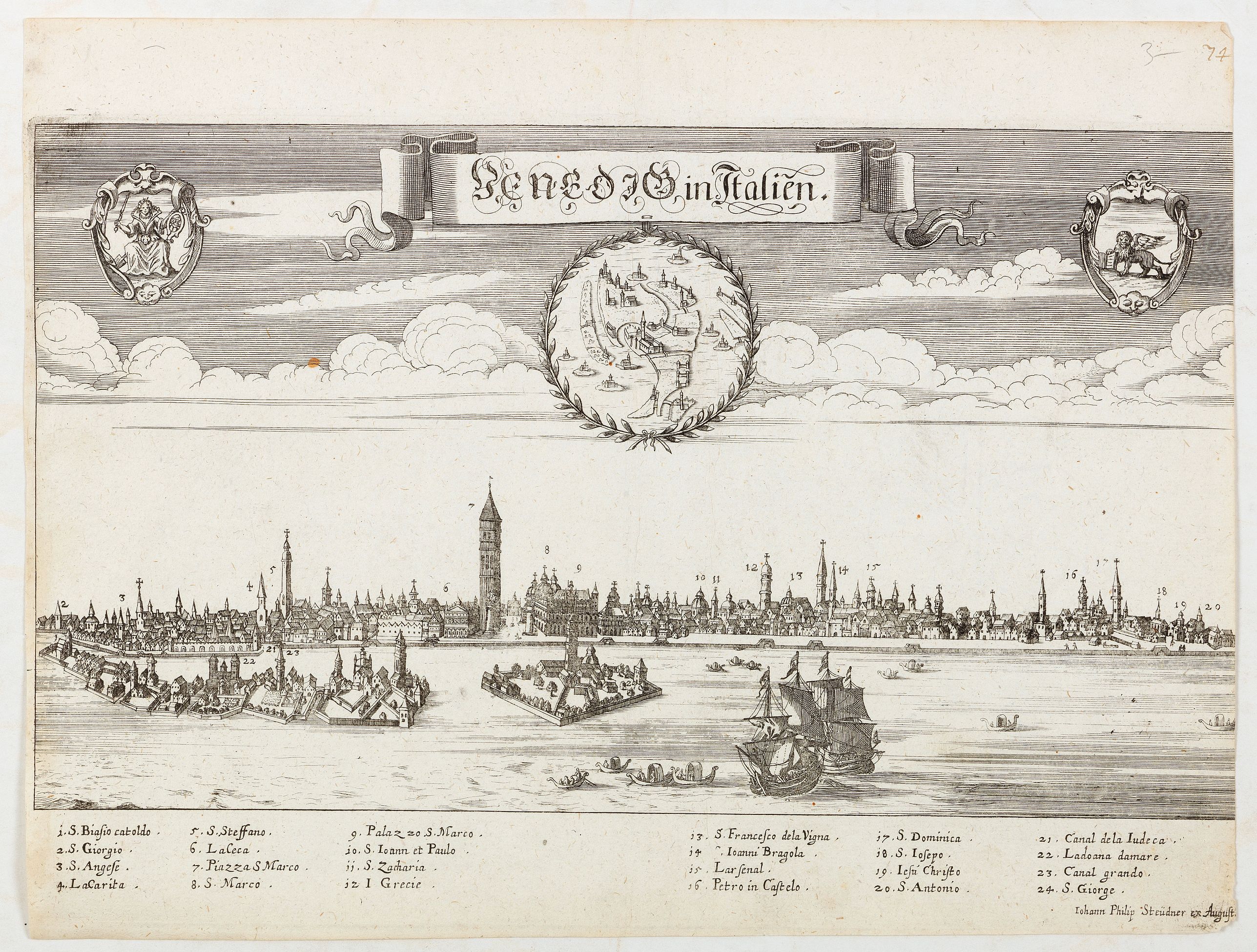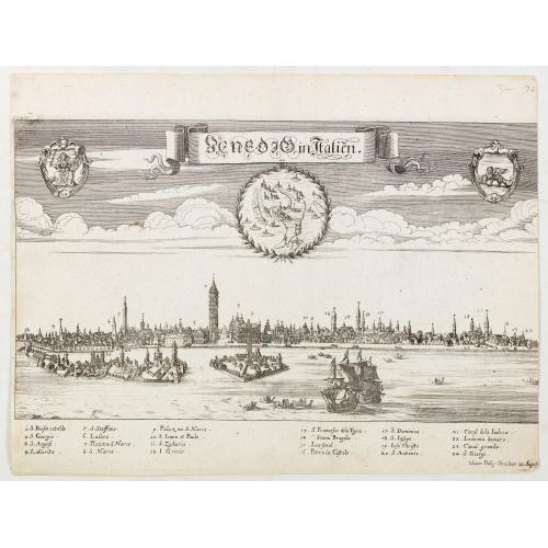 View of Venice with a numbered key 1-24. Lower right below the legend " Iohan Philip Steüdner ex Augusta". From "Theatrum Adriaticum, oder Schau-Platz deß adriatischen Meers / dem curiosen Leser, wie auch denen Reisenden, zur Nachricht und Belustigung, historisch vorgestellet und mit schönen Mappen und Kupffer-Figuren vermehret".