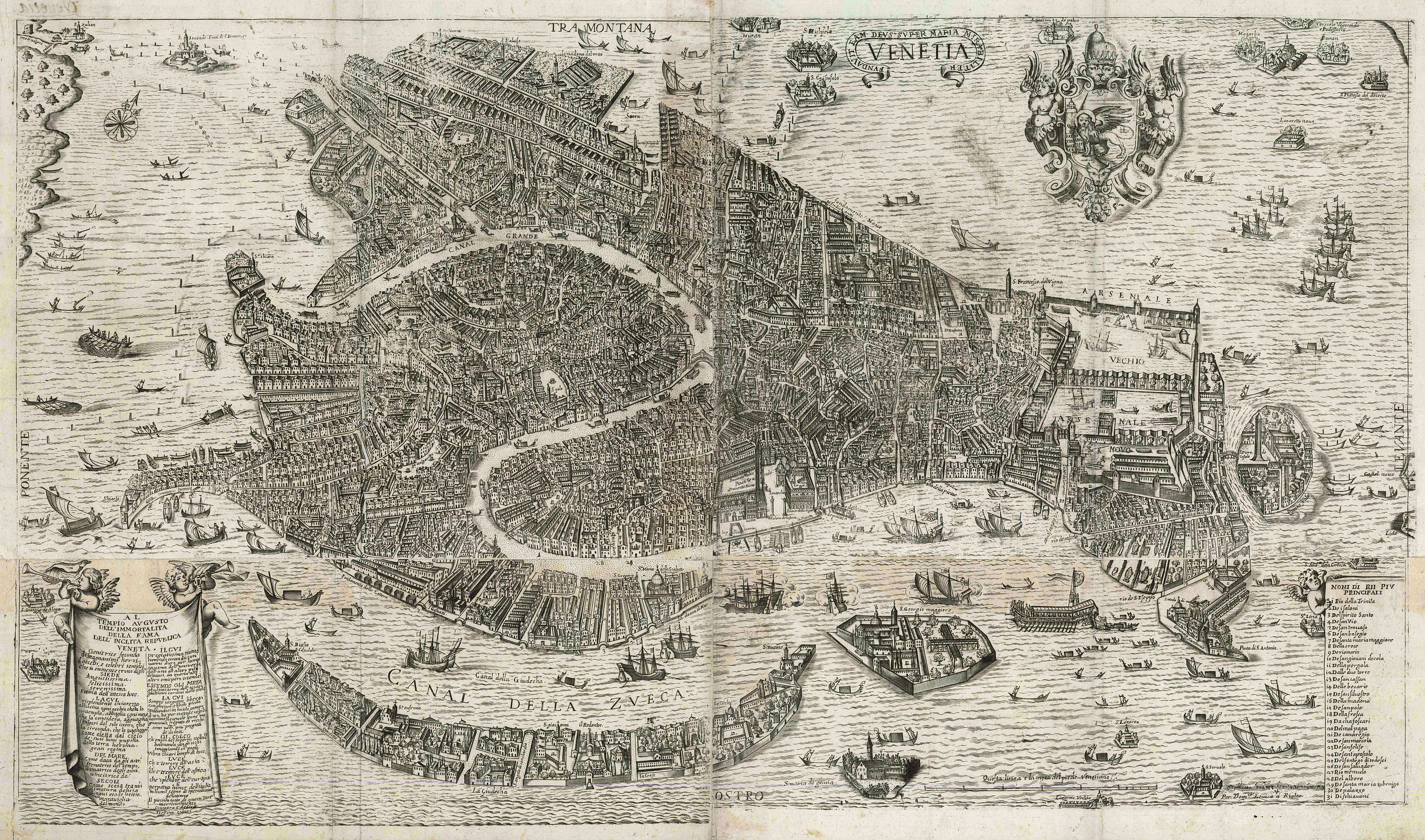 Birds-eye view of the city of Venice, on four joined sheets. The map shows the city and the surrounding islands, buildings and other structures. The islands, canals and squares are labeled. The Grand Canal and the harbour are embelished with sailing ships, boats and gondolas. Illustrations depict the Venetians, constructing gondolas and chopping firewood.