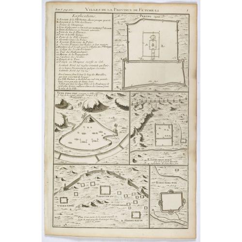 Five town plans : Peking (with forbidden town), Yung-ping-fou, Long-men-hien, Yuen-keou/Tching-sse-yu/Si-yang-keou/Hoang-tou-in, Tchin-ting-fou.