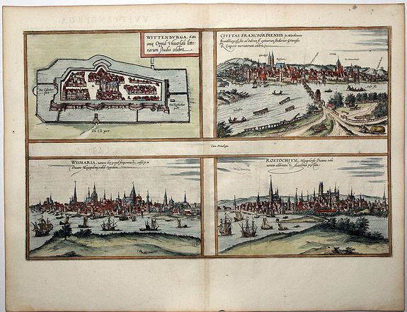 Wittenburga Saxoniae oppidum, ... [on sheet with] Civitas Francfordiensis In Marchionatu Brandeburgensi, ... [and] Wismaria, ... [and] Rostochium, ...[LUTHERSTADT WITTENBERG, ROSTOCK,WISMAR,FRANKFURT/ODER] |