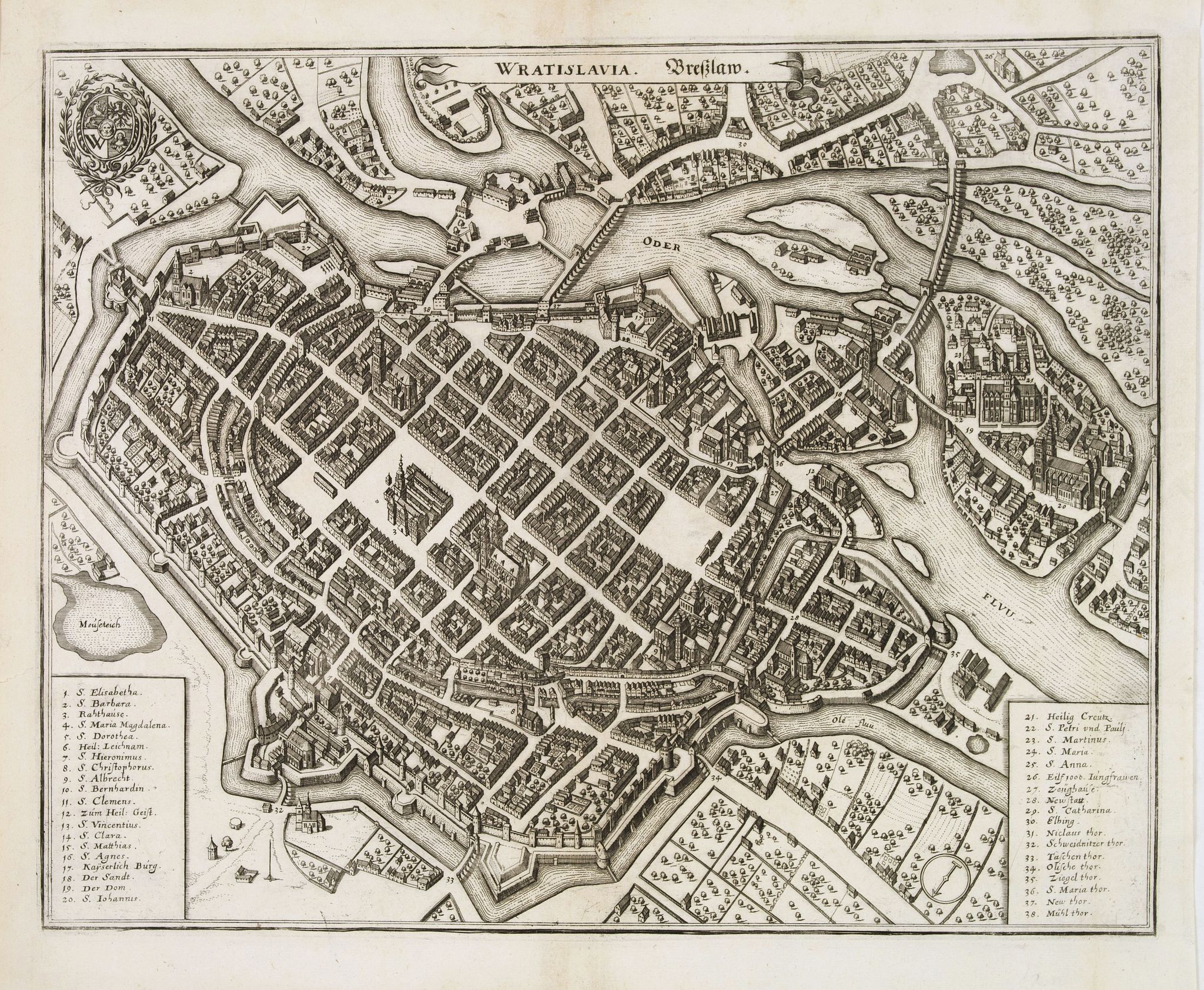 Decorative town-plan of the Polish city of Wroclaw, once known as Breslau. The engraving is by the famed Swiss engraver Matthew Merian. A numbered key (1 - 38) the corners detail the important sites in the historic city.