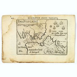 Finely engraved map of the Vaigach Straits, from Bertius's rare miniature atlas. The map focuses on the straits between Novaya Zemlya and the Russian mainland, which had ...