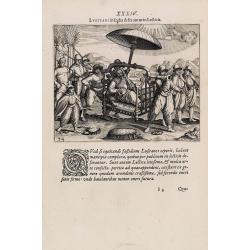 Illustration from seventh part of De Bry’s Petits Voyages, including Gasparo Balbi's voyage to Pegu via Syria in 1579-1588. The plate is showing a water pump driven by ...