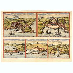 Views of the five northern and western African coastal town-view on one sheet: Latin text.From the greatest publication in this genre!. The Civitates was compiled and wri...