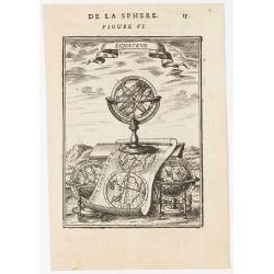 Appealing print depicting an armillary sphere.From the French text edition of Description d'Univers.. (5 volumes), 1683. By Allain Manneson Mallet (1630-1706), a well tra...