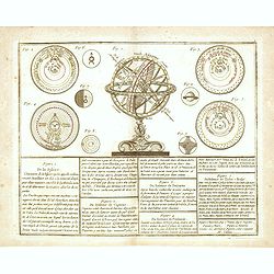 Appealing print focused on an armillary sphere. The latter is surmounted by a cartouche containing some angles in a circle.From the French text edition of Description d'U...