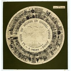 This Goose game board is inspired by Jules Verne's novel whose boxes are illustrated with town views and figures and the center is occupied by a world map. Vignette illus...