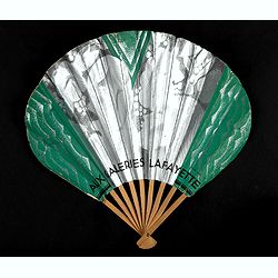 Decorative fan for Galeries Lafayette department store in Paris. Recto and verso illustrations. Printed by Georges Lang Paris.Read more about folding fans. [+]