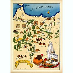 Very decorative, informative map of Marocco. The map is filled with buildings, animals, a ship, figures and three locals in their typical dress.In lower left corner "...