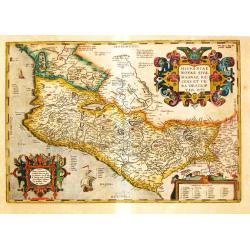 Abraham Ortelius’ map of Mexico appeared for the first time in the ‘Additamentum II’. State 2 with dots behind the names in the sea part. Strong decorative embellis...