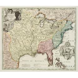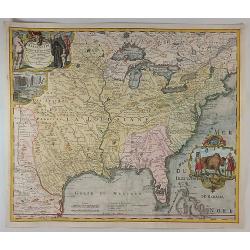 Carte De La Nouvelle France, ou se voit le cours des Grandes Rivieres de. S. Laurens & de Mississipi Aujour d'hui S. Louis, Aux Environs des-quelles se trouvent les Etats, Pais, Nations, Peuples &c. de la Floride, de la Louisiane, de la Virginie, de la M