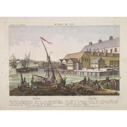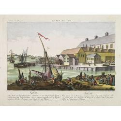 A so-called optical print. A lively scene from the harbour of Salem with many people loading a vessel. Engraver: Balthazar Frederic Leizelt.