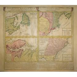 Four maps on one sheet (New Foundland/ New England/ Virginia and Carolina/Florida) based on J.B.Homann\'s map, showing British possessions in North America. At bottom of ...