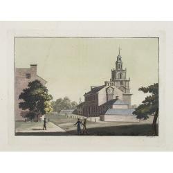 Aquatint depicting the State House in Philadelphia engraved by Fumagalli. Plate N°42.From Giulio Ferrario's work Le Costume Ancien et Moderne ou Histoire du gouvernement...