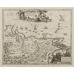 From the first edition of the last part of the Latin "Atlas maior" dedicated to America.A finely engraved, decorative map. The islands Trinidad, Margarita, Arub...