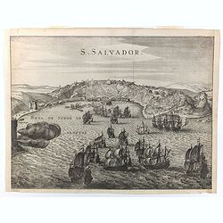Fine copper engraving of the walled city of San Salvador, with numbered key at the top. Ships and boats fill the harbor in the foreground.This map is taken from Ogilby's ...
