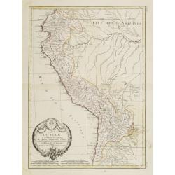 Attractive map of Peru, ornated with a decorative title cartouche. Boundaries outlined in hand color.Prepared by Le Sieur Janvier, Jean Denis [Robert], French geographer ...