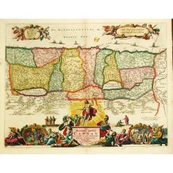 A detailed map of the Turkish Empire by Holland's leading mapmaker at the end of the seventeenth century. The cartouche shows an Ottoman administrator ,or possibly the S...