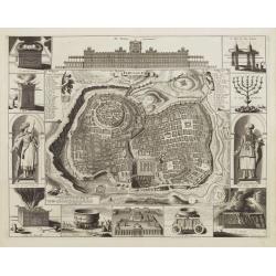Great bird's eye plan of the holy city flanked by engravings of religious icons, and two priests. At the top is a large elevation of the Temple of Solomon and at bottom i...