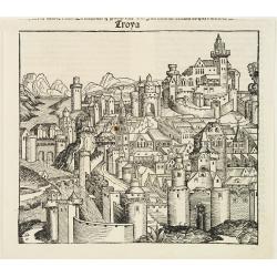 An imagionary view of Troy with numerous buildings shown. With text on both sides. Published in Hartmann Schedel's famous work: "liber chronicarum". Probably fr...