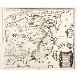 Detailed miniature map of the eastern part of China, from a German text edition of his Atlas Minor. Engraved by Petrus Kaerius.