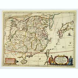 A splendid map of China heightened in gold. Besides China, the map depicts Korea as an elongated island and Japan from the Teixeira model of 1595. Decorated with strapwor...