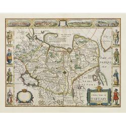 One of the most decorative maps of Tartary, known for its figured borders with people in local dress, among them a woman and man in local dress. Upper panel of town panor...