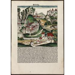 Decorative colored incunable leaf in folio showing an imaginary view of Walachia (Romania) by Hartmann Schedel. From the famous Liber chronicarum or Nuremberg Chronicle i...