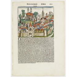A imaginary view of Naples (19x22cm.), however the earliest obtainable view of this period.Page from the richest illustrated Incunable, the famous: Liber chronicarum or N...