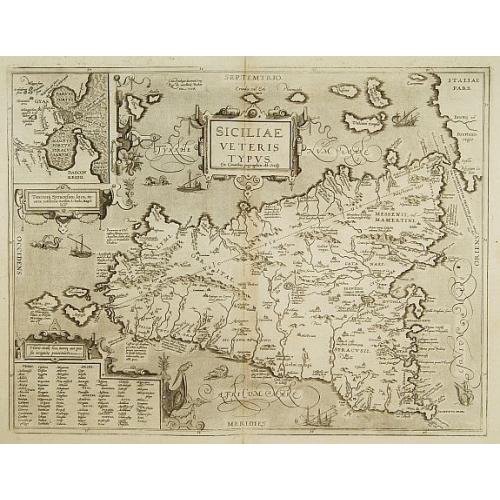 A very beautiful early map of ancient Sicily. Title cartouche centred on the upper part: includes also an inset map of Syracuse in the upper left, and a list of the towns...