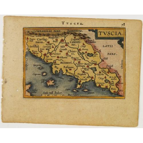 Very fine map bu Ortlius including the towns of Pisa, Florence, Siena, etc. The map is based on Stefano Buonsignori's map.Copper engraving with French text on verso. Abra...
