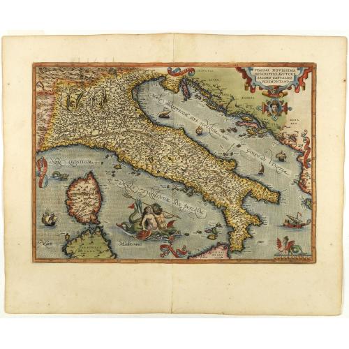 Very fine map of Italy after Giacomo Gastaldi. Embellished with a title cartouche, vessels, sea monsters and sea gods. No text on verso.Abraham Ortelius (1527-1598) was a...
