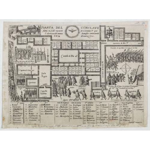 Scarce representation of the conclave of March 1605. Numbered key with 69 references below the plan."Pope Clement VIII died in March 1605. The 60 cardinal electors w...