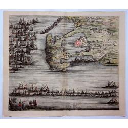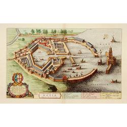 A most attractive and fascinating bird's eye plan of this small port near the mouth of the Tiber. Dedicated to Cornelis Witsen, senator of Amsterdam and traveller. Joan B...