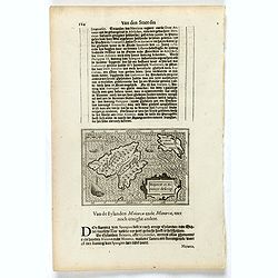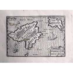 Superb miniature map of the Balearics. Including a sailing ship, sea monsters, and the title cartouche. After Barent Langenes from his Caert-Thresoor. Very rare and at...
