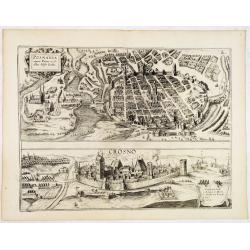 Bird's eye-view of Warsaw. With a smaller frontal view of the town in the lower part and 2 insets in the upper corners illustrating Louwitz or Lowicz Castle. Engraved by ...