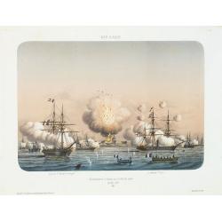 Beautiful lithography of the vessels Blenheim and l'Exmouth bombarding the forts at the entrance of the river and town of Narva in July 1855.After a design Louis by Le Br...