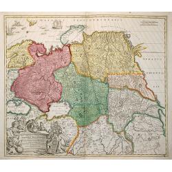 An attractive large-scale map depicting Lithuania, embellished with a large title-cartouche with coat of arms. Published in Amsterdam by Renier and Joshua Ottens. Joachim...