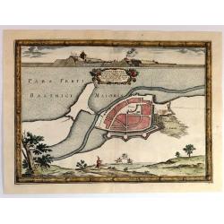 A beautiful engraved plan of the fortified town of Nakskov Lolland Island in Demnark. Engraved on copper with a view of the fortress. With a floral title cartouche and pi...