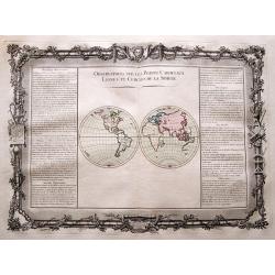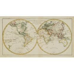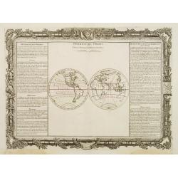 Attractive double hemisphere world map, surmounted by a finely engraved and elaborate title piece. A good example of elegant French cartography. This edition dated 1782.