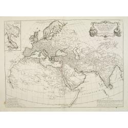 Finely and crisply engraved map of Europe, Asia and Africa, prepared by d'Anville. With inset map of the Indochinese Peninsula in the upper left corner.Venetian edition o...