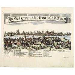 This very rare bird's-eye view shows Istanbul across the Bosphorus. It is beautifully engraved with many details and scenes of every-day life, including merchants with ca...