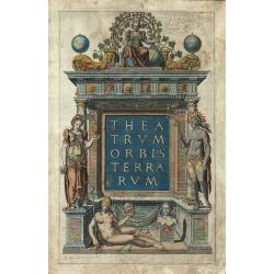 Title page of "Theatrum Orbis Terrarum" verso text EPIGRAMMA DANIELIS ROGERII ALBIMONTANI, A decorative title page from Ortelius's first atlas. Latin Edition.