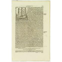 On recto a description of the expedition of Ferdinand Magellan with a wood block printed depiction of his ship "Victoria" (69x65mm.)From a Latin text edition of...
