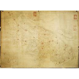 A rare and impressive pictorial Qing Empire map of the western part of Taiwan. Gouache on paper. The map is filled with numerous small pictorial scenes of aboriginals at deer hunting and scenes of daily life. Chinese merchants, voyagers, military scenes, and arriving Chinese junks. Along the top is a red line., the so-called thóo-gû-kau